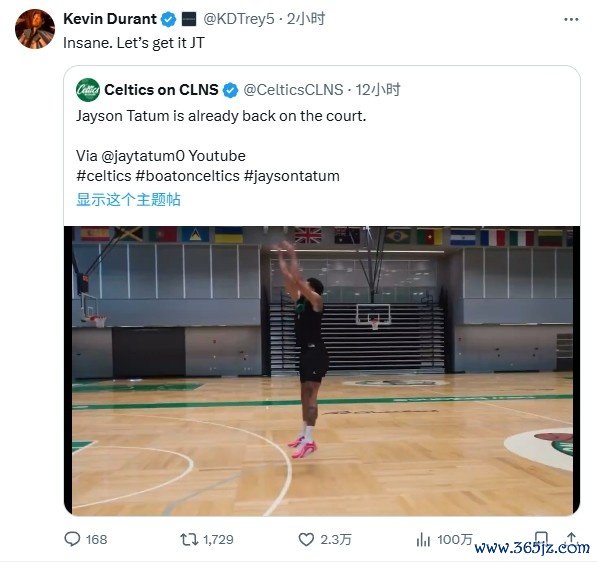 火箭球星杜兰特转发了这段视频, 巴黎圣日耳曼体育赛事并写道:“疯狂, 布伦特福德助威 JT!”