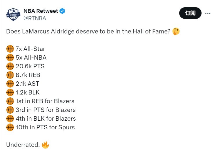 8月23日讯 今天,美媒NBA Retweet晒出了阿尔德里奇职业生涯的数据和荣誉, 巴黎圣日耳曼法甲直播并在旁边发问:“阿尔德里奇是否值得入选名人堂?”