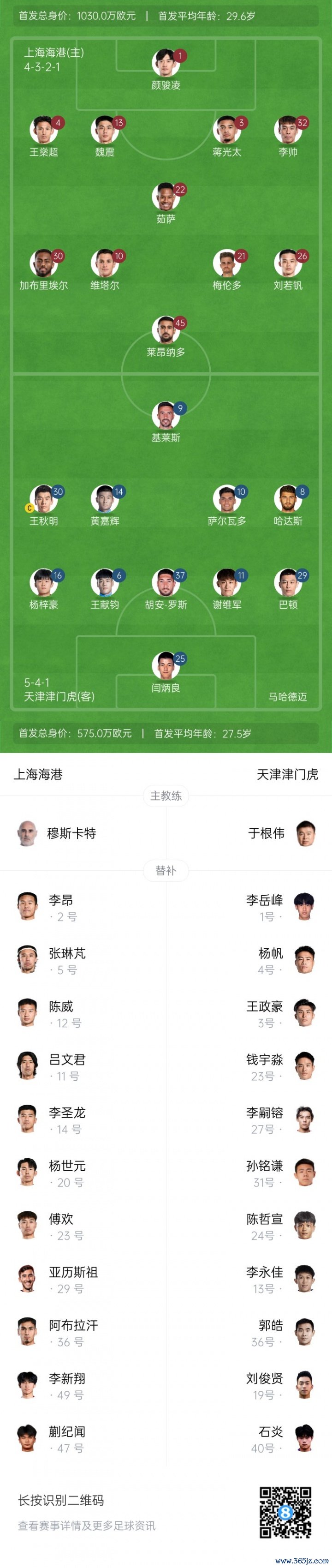 上海海港杆位:1-颜骏凌、3-蒋光太、4-王燊超、13-魏震、32-李帅、10-马特乌斯-维塔尔(F)、21-梅伦多(F)、22-马修斯-茹萨(F)、26-刘若钒、30-加布里埃尔(F)、45-莱昂纳多(F)