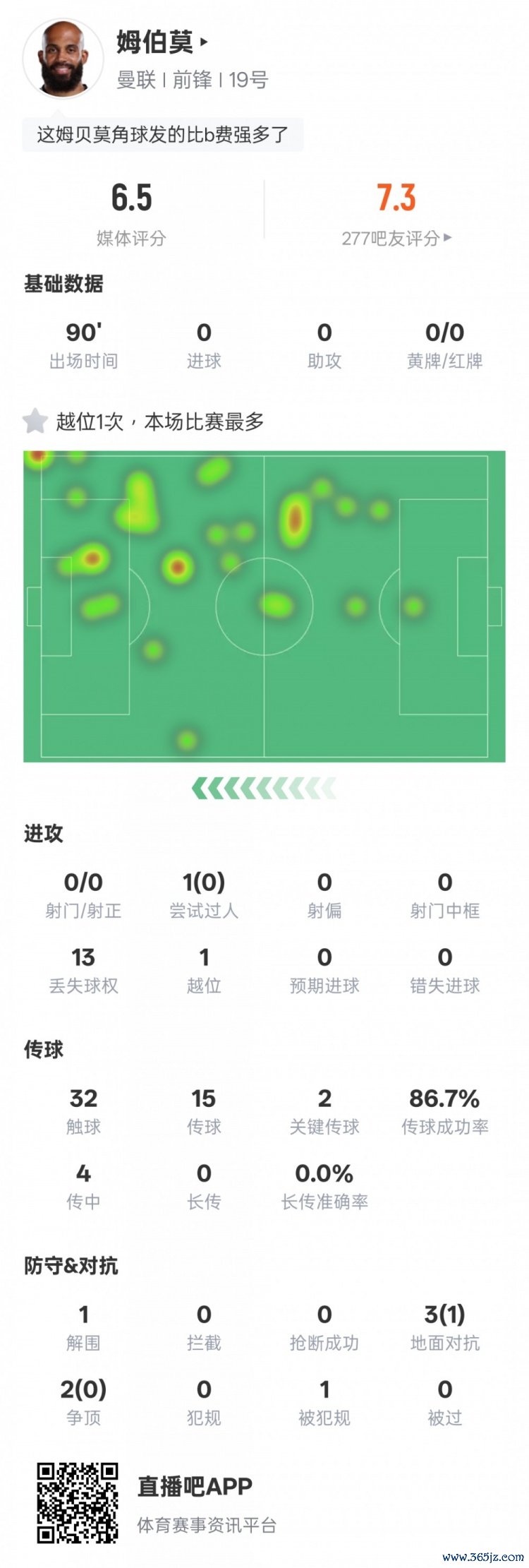姆伯莫本场赛事 数据如下: