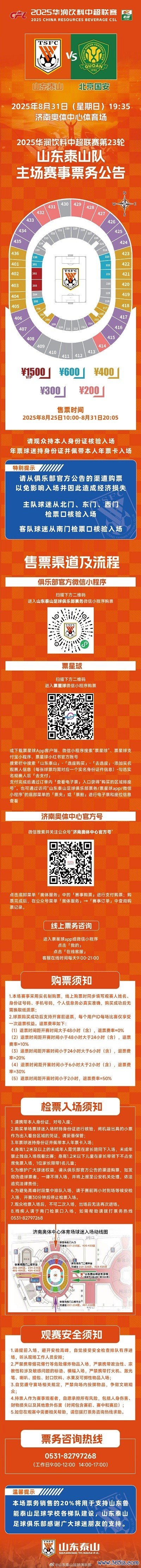 2025华润饮料中超职业联赛 第23轮山东泰山队主场作战 赛事票务公告