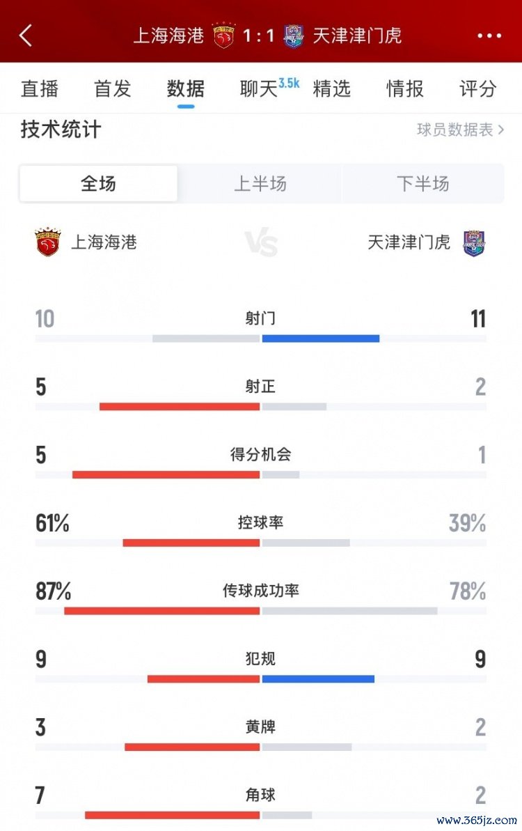 8月24日讯 中超职业联赛 第22轮,上海海港1-1天津津门虎,莱比锡红牛五大联赛三连胜终止, 巴黎圣日耳曼距榜首1分。以下为双方全场数据对比
