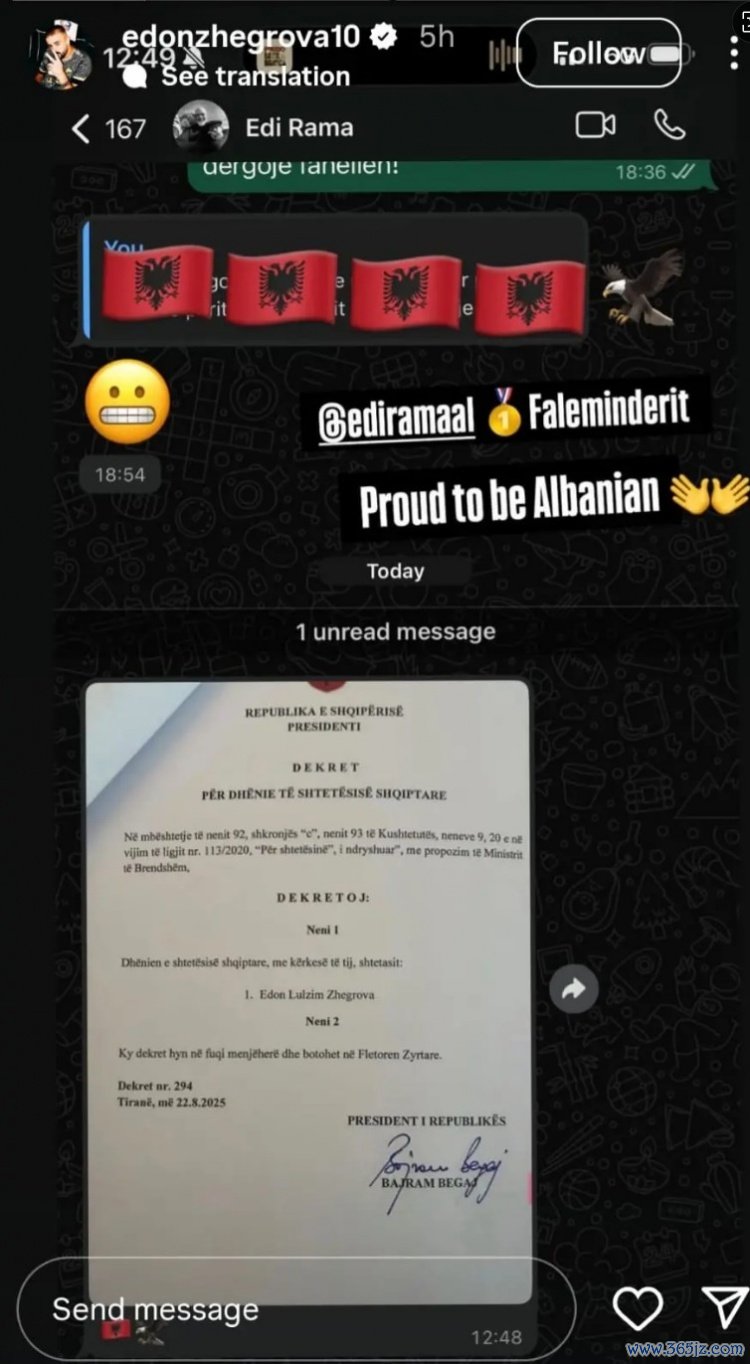 周二,哲格罗瓦在他的Instagram故事中分享了一段与阿尔巴尼亚总统埃迪-拉玛的WhatsApp对话片段,显示他已经获得了阿尔巴尼亚国籍。有趣的是,拉玛是尤文图斯的忠实支持者。