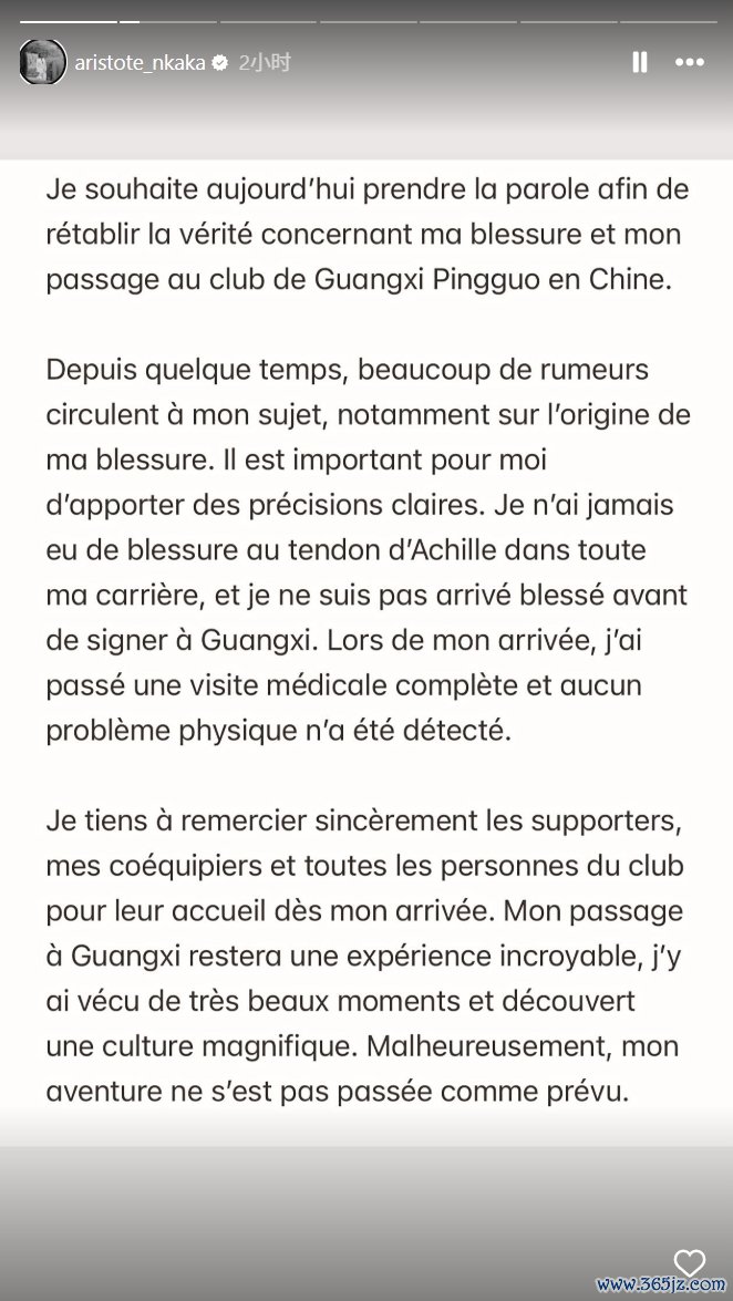 最近几周出现了许多关于我的传言,尤其是关于我受伤 根源的说法。我认为有必要说明实际情况:在我的整个职业生涯中,从未遭遇过跟腱损伤,与广西队签约时也并非带伤抵达。抵达俱乐部后我接受了全面体检,当时并未检出任何强健 问题。