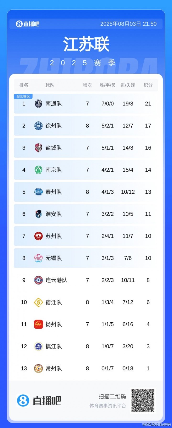 在苏超积分榜上, 巴黎圣日耳曼直播平台常州队1平7负继续垫底, 布伦特福德笔画保卫战再次告负后,常州队现在已经变成了“丨”队;南通队则以7场全胜的战绩高居积分榜榜首。