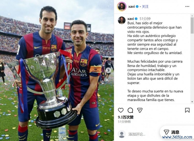 9月27日讯 37岁的西班牙传奇中场布斯克茨宣布将在本赛季结束后退役,他和哈维、伊涅斯塔曾在巴萨组成了坚不可摧的中场三角。在社交媒体上,哈维为老友送上了祝福。