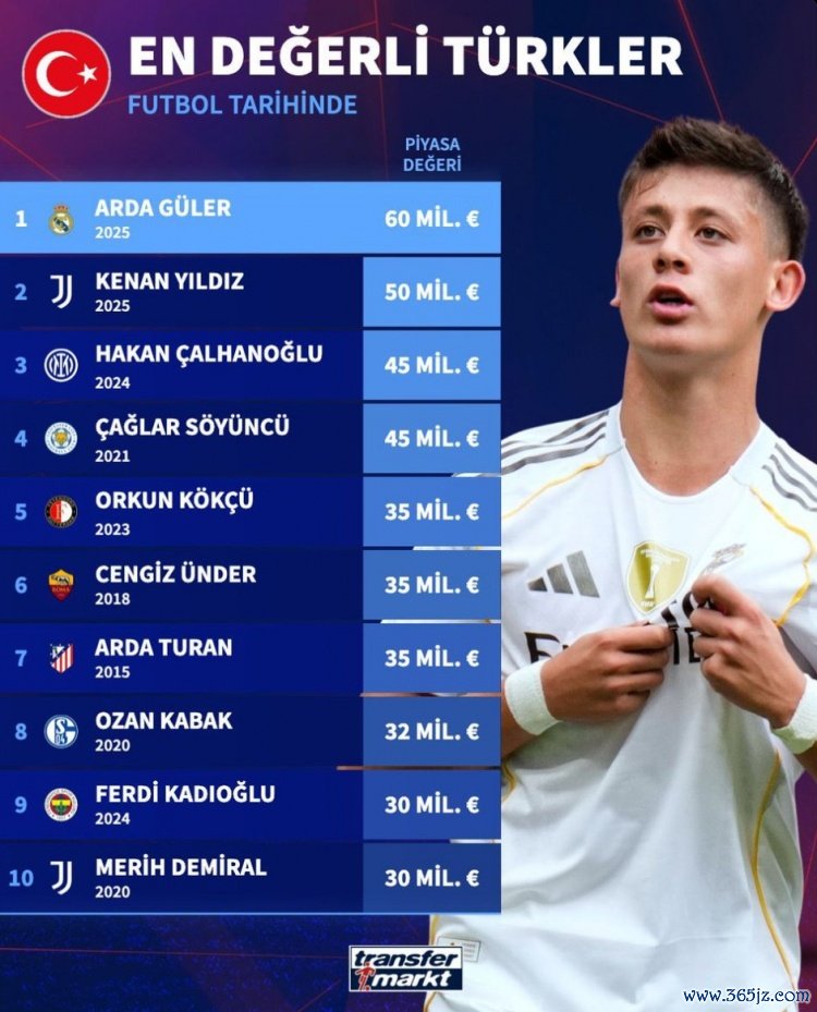 根据德国转会市场网站的数据,效力于皇马的居勒尔成为了迄今为止土耳其历史上身价最高的球员。