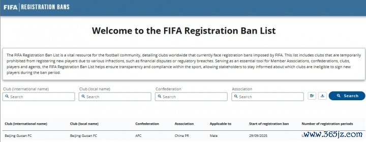 FIFA官方消息,国际足联注册禁令披露系统9月29日公布新增北京国安一条禁令,禁令为无限期直至案件解决。