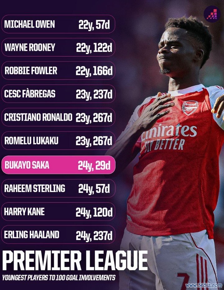 以下为英超历史达成直接参与100球最年轻纪录榜, 巴黎圣日耳曼萨卡位列第7。