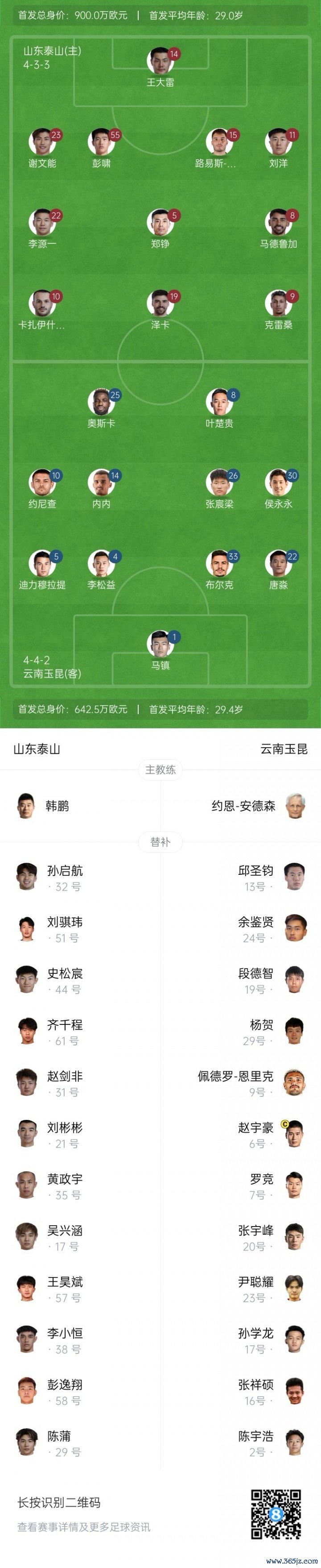 山东泰山首发:14-王大雷、5-郑铮、11-刘洋、15-路易斯-洛佩斯(F)、55-彭啸、8-马德鲁加(F)、22-李源一、9-克雷桑(F)、10-卡扎伊什维利(F)、19-泽卡(F)、23-谢文能