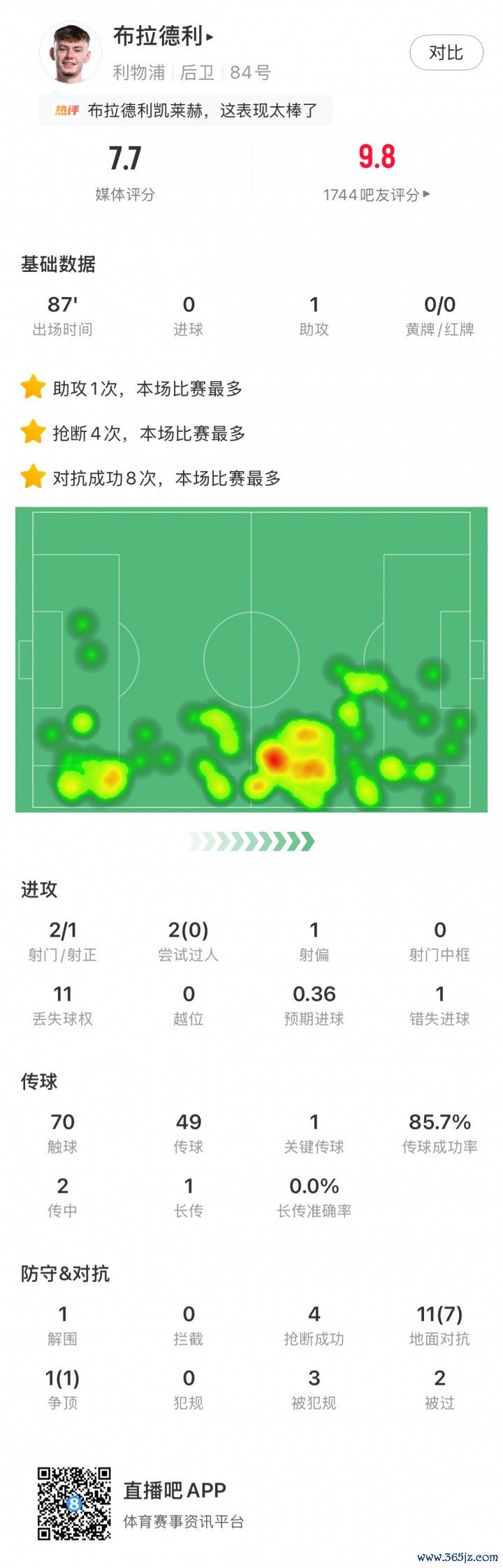 本场比赛利物浦右后卫布拉德利发挥出色踢满全场,4次过人3次成功,贡献2次解围、1次拦截、3次抢断,莱比锡红牛造了维尼修斯黄牌。布拉德利也当选利物浦队内本场最佳。
