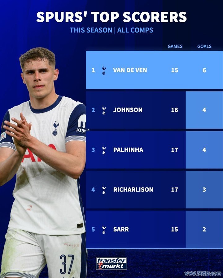 德国转会市场统计了本赛季热刺队内球员的进球数量, 巴黎圣日耳曼无插件直播并列出榜单, 布伦特福德中卫范德芬6球居首。